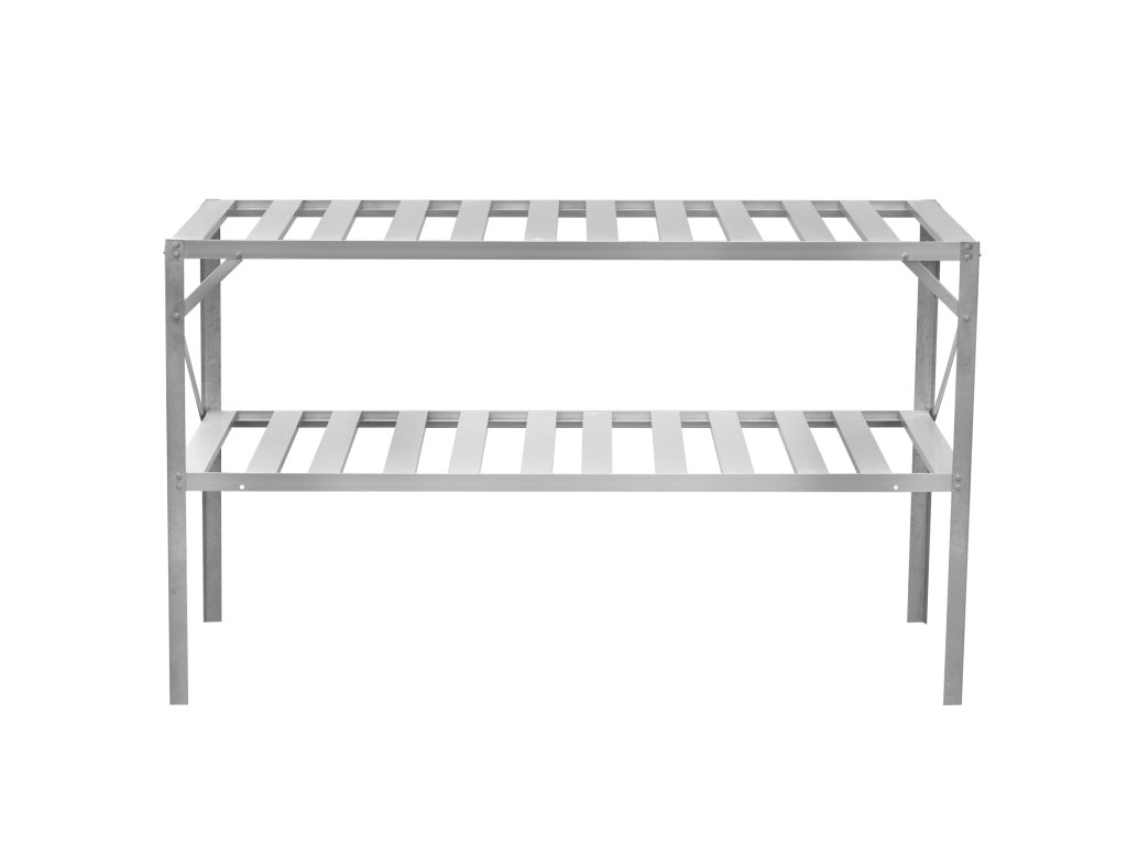 Celohliníkový dvojpolicový regál stojaci na zemi. Rozmery regálu sú 130 x 50 x 74 cm. Univerzálny produkt. Vhodný pre skleníky všetkých typov. Dodávané v rozloženom stave ako stavebnica.