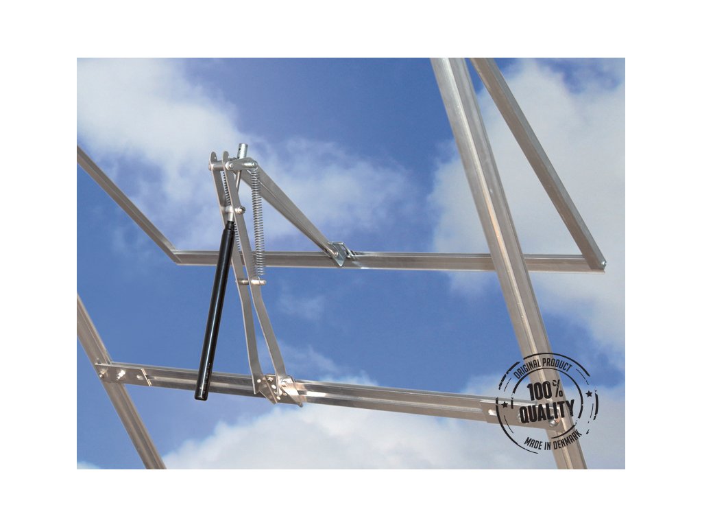 Vysoko kvalitný a robustný automatický otvárač pre strešné okno - piest s pákou, ktorým nahradíte manuálne otváranie. Piest funguje na báze tepelnej rozťažnosti vosku a so zvyšujúcou sa teplotou v skleníku posúva/hýbe s pákou a otvára okienko. Konštrukcia otvárača je v striebornej farbe, piest je čierny. Otváranie je možné nastaviť v rozmedzí teplôt 7°C až 25°C. Otváracia výška cca 45 cm, sila otvárania cca 7 kg.