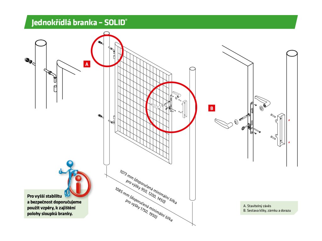 Plotová bránka jednokrídlová SOLID výplň zváraná sieť - 1073 (šírka na stred stĺpikov) x 1200 mm s dozickým zámkom Pilecký. Záhradná jednokrídlová bránka SOLID je vysoko odolné, kvalitné, jednoduché a lacné riešenie pre Váš pozemok. Pre vyššiu stabilitu a bezpečie odporúčame použiť vzpery, na zaistenie polohy stĺpikov bránky.