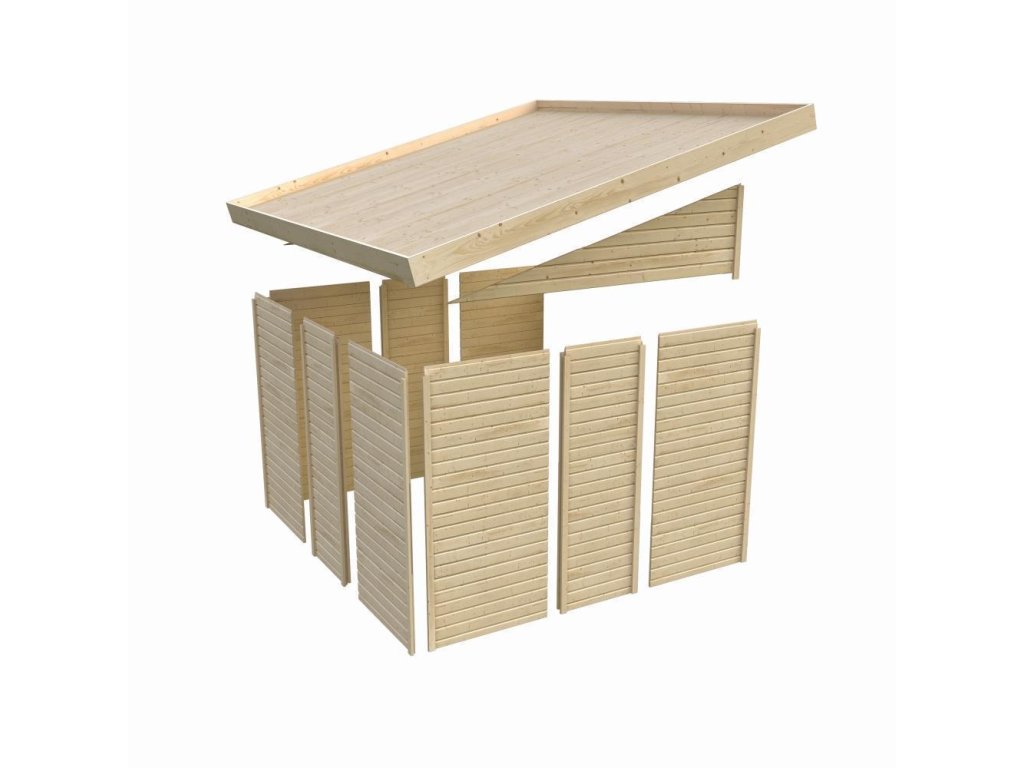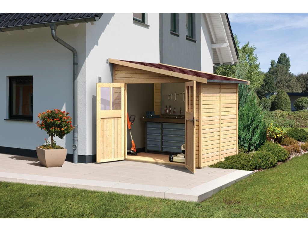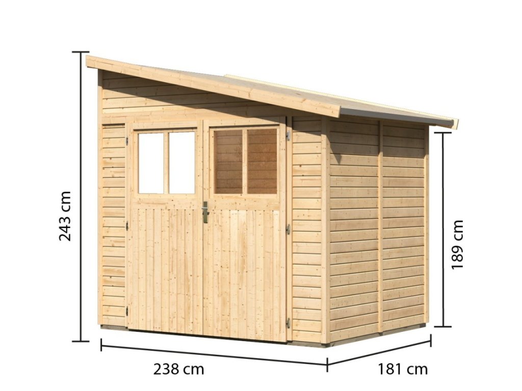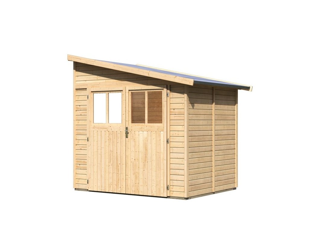 Drevený domček k stene. V domčeku môžete uskladniť záhradnú techniku, náradie alebo si v ňom vybudovať kutilskú dielňu. Domček má šikmú strechu a jedny dvojkrídlové dvere na pántoch s oknom v každom krídle. Stavebným materiálom domčeka sú drevené profily hrúbky 19 mm perfektne vyfrézované zo severského smreka. Dodávame ako stavebnicu v rozloženom stave, kde steny tvoria jednotlivé drevené profily, ktoré iba zosadíte k sebe a zoskrutkujete, strechu tvorí celistvá doska. To garantuje extrémne jednoduchú montáž, ktorú zvládne každý slovenský kutil.