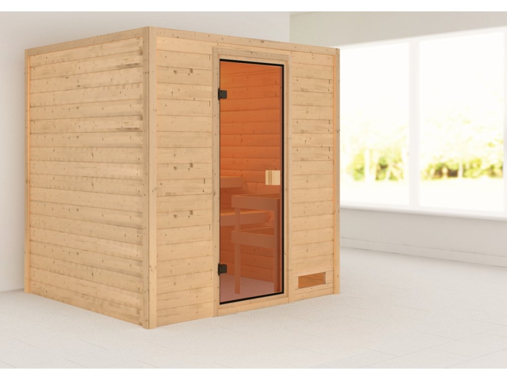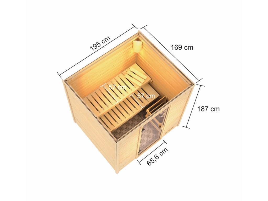 Fínska sauna určená pre dve ležiace osoby. Rozmery š 195 x h 169 x v 187 cm. Tento model fínskej sauny je určený do temperovaných interiérov domu alebo bytu. Jej výrobca, firma KARIBU HOLZTECHNIK z nemeckých Brém, dokázala svojimi výrobkami úspešne nadviazať na stáročnú tradíciu škandinávskeho saunovania a súčasne do nej zapracovať dnešné moderné technológie. Sauna je celá vyrobená z dreva severského smreka v prírodnom prevedení. Drevo pochádza zo vzdialeného severu Európy a je chemicky úplne neošetrené (nie je ani namorené ani nalakované). V dôsledku toho je prosté všetkých známych problematických látok, ktoré by sa v priebehu saunovania mohli z dreva uvoľňovať. Táto interiérová sauna je vyrobená z masívneho dreva hrúbky 38 mm. Steny sauny sú zložené zo špeciálne hladených dosiek s dvojitým perom a drážkou, čo garantuje neobyčajnú pevnosť spoja.