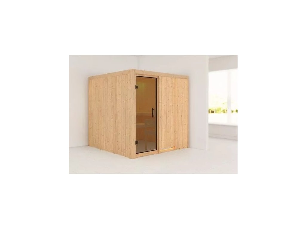 Fínska sauna určená pre dve ležiace osoby. Má štvorcový tvar š 196 x h 196 x v 198 cm. Tento model fínskej sauny je určený do temperovaných interiérov domu alebo bytu. Jej výrobca, firma KARIBU HOLZTECHNIK z nemeckých Brém, dokázala svojimi výrobkami úspešne nadviazať na stáročnú tradíciu škandinávskeho saunovania a súčasne do nej zapracovať dnešné moderné technológie. Sauna je celá vyrobená z dreva severského smreka v prírodnom prevedení. Drevo pochádza zo vzdialeného severu Európy a je chemicky úplne neošetrené (nie je ani namorené ani nalakované). V dôsledku toho je prosté všetkých známych problematických látok, ktoré by sa v priebehu saunovania mohli z dreva uvoľňovať. Táto interiérová sauna vykazuje mimoriadne tepelno-izolačné vlastnosti. Steny sauny sú zložené z vnútornej a vonkajšej vrstvy špeciálne hladených dosiek s perom a drážkou, medzi ktorými je 42 mm hrubá tepelná izolácia v podobe minerálnej vlny. Celková hrúbka steny je tak 68 mm. Zadné alebo bočné nepohľadové strany orientované k stene miestnosti majú vonkajšiu stranu zo sololitu. Preto sú pri rovnakej tepelnej izolácii o cca 10 mm tenšie ako pohľadové strany pokryté palubovkami.