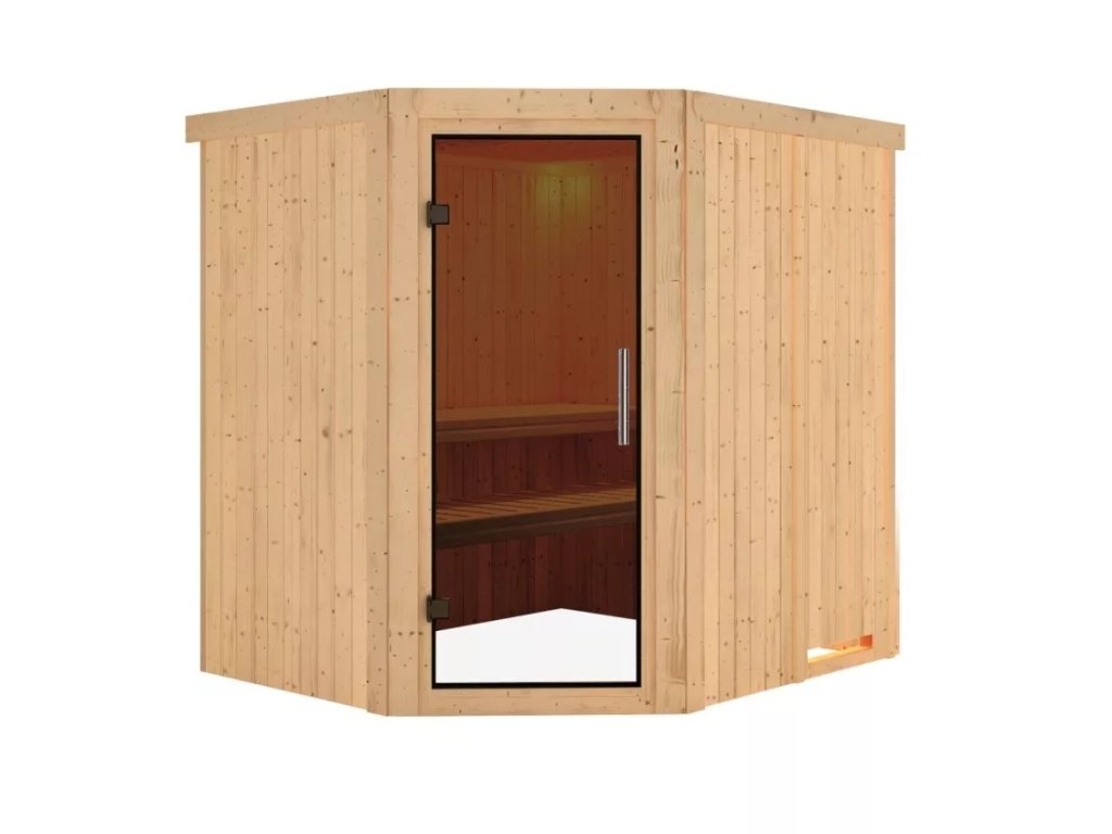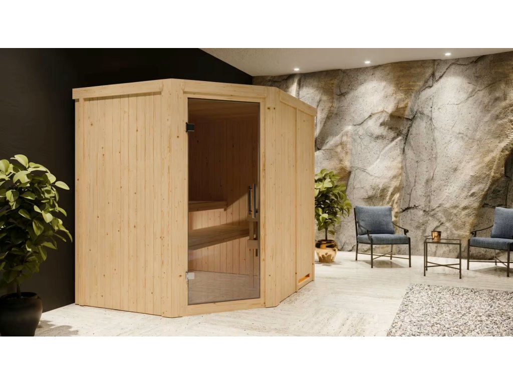 Fínska sauna je určená pre dve ležiace osoby. Má rozmer š 196 x h 170 x v 198 cm s rohovými dverami. Tento model fínskej sauny je určený do temperovaných interiérov domu alebo bytu. Jej výrobca, firma KARIBU HOLZTECHNIK z nemeckých Brém, dokázala svojimi výrobkami úspešne nadviazať na stáročnú tradíciu škandinávskeho saunovania a súčasne do nej zapracovať dnešné moderné technológie. Sauna je celá vyrobená z dreva severského smreka v prírodnom prevedení. Drevo pochádza zo vzdialeného severu Európy a je chemicky úplne neošetrené (nie je ani namorené ani nalakované). V dôsledku toho je prosté všetkých známych problematických látok, ktoré by sa v priebehu saunovania mohli z dreva uvoľňovať. Táto interiérová sauna vykazuje mimoriadne tepelno-izolačné vlastnosti. Steny sauny sú zložené z vnútornej a vonkajšej vrstvy špeciálne hladených dosiek s perom a drážkou, medzi ktorými je 42 mm hrubá tepelná izolácia v podobe minerálnej vlny. Celková hrúbka steny je tak 68 mm. Zadné alebo bočné nepohľadové strany orientované k stene miestnosti majú vonkajšiu stranu zo sololitu. Preto sú pri rovnakej tepelnej izolácii o cca 10 mm tenšie ako pohľadové strany pokryté palubovkami.