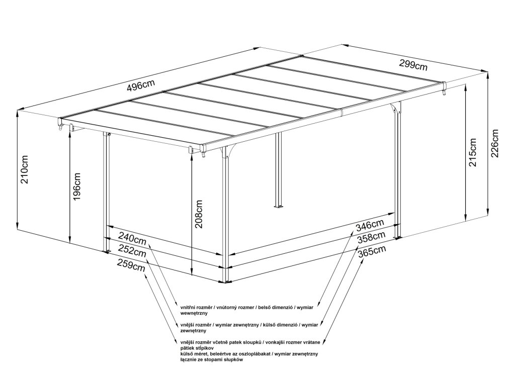 - vonkajšia dĺžka (od oboch okrajov strechy) je 4,96 m