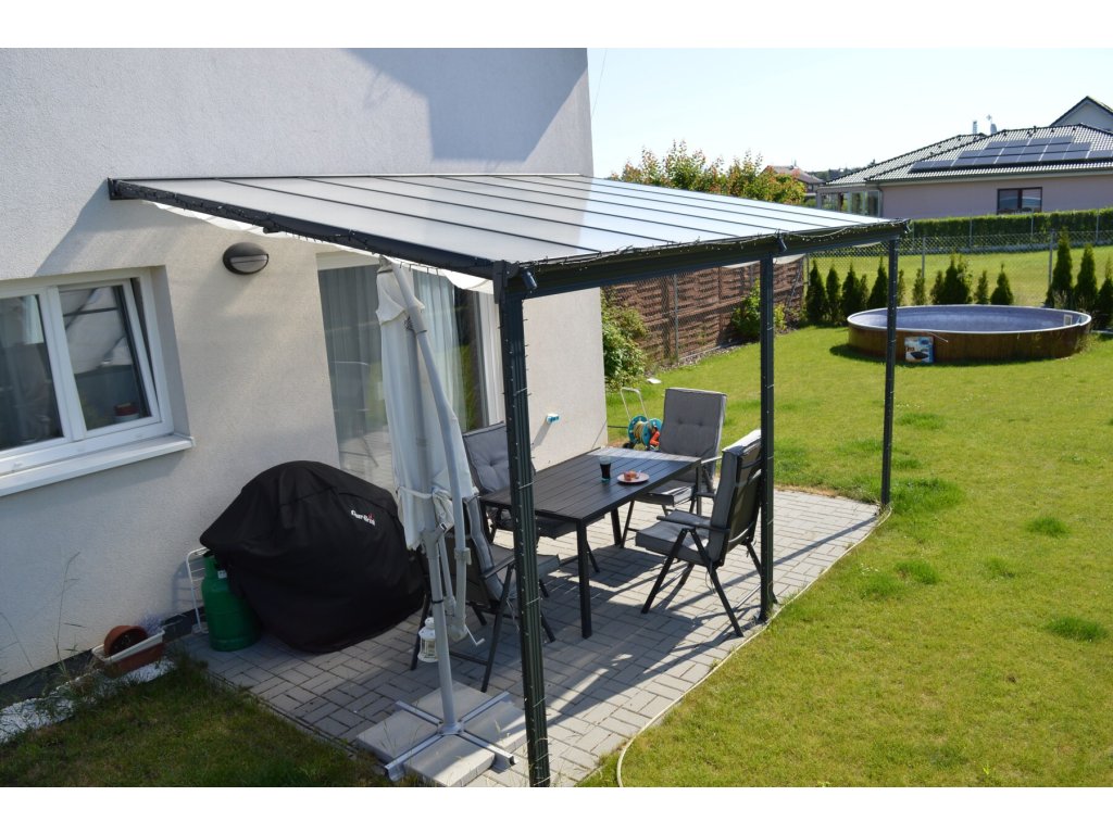 Hliníková pergola k stene, v ktorej nájdete príjemné miesto odpočinku hneď vedľa vášho domu. Konštrukcia pergoly je z odolnej hliníkovej zliatiny a je nastriekaná práškovou vypaľovanou farbou (komaxit), a preto trvalo odoláva prírodným klimatickým vplyvom. Strecha je vyrobená z polykarbonátových komôrkových dvojstenných dosiek hrúbky 6 mm, ktoré dodávame v 3 odtieňoch - číre alebo mliečne biele priesvitné (tzv. OPÁL) alebo dymovo hnedé (BRONZ). Z dôvodu zaistenia maximálnej kvality používame na strechu pergoly výhradne prémiové komôrkové polykarbonátové dosky MARLON ST LONGLIFE (výrobca BRETT MARTIN Veľká Británia), ktoré v ČR prešli náročným testami v štátom akreditovaných skúšobniach ako stavebný materiál (požiarne skúšky, mechanické skúšky). Na nerozbitnosť polykarbonátovej strechy krupobitím poskytujeme zmluvnú predĺženú záruku 10 rokov.