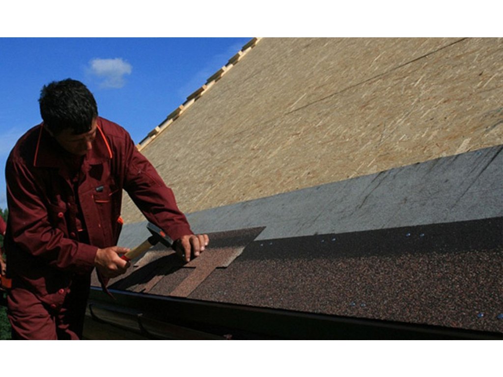 - Po „zalepenkovaní“ a oplechovaní strechy je nutné začať kryť strechu od odkvapovej hrany originálnym univerzálnym odkvapovým/hrebeňovým pásom, ktorý má obrovskú výhodu vo veľkej prelepenej styčnej ploche, ktorá tak lepšie priľne k oplechovaniu odkvapovej hrany a nemôže tak dôjsť k zatečeniu pod šindeľ, zvlášť v zimnom období, keď je ťažší odvod vody z pododkvapových žľabov