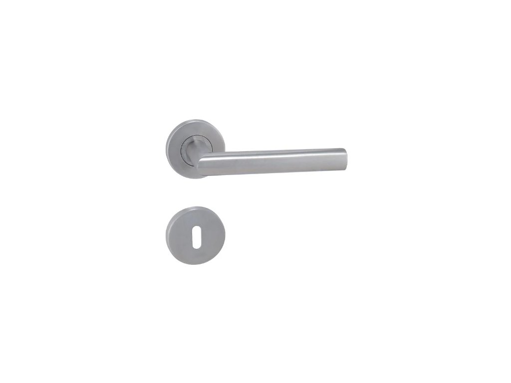 Rozetová kľučka na interiérové dvere s guľatou rozetou z kvalitnej nehrdzavejúcej ocele, známe ako nerez a je povrchovo upravená.