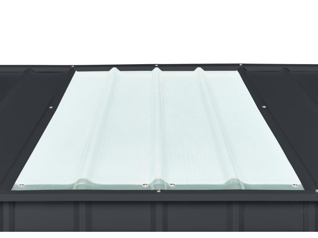 Tento domček GLOBEL sa od bežnej produkcie odlišuje jedinečným presvetlením strechy. Pevné zabudované strešné okno je vyrobené tak, že jeden plechový diel strechy je nahradený rozmerovo zhodným dielom zo sklolaminátu. Vďaka presvetleniu strechy je v domčeku dostatok svetla.