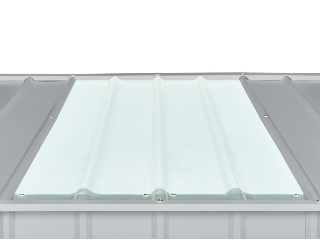 Tento domček GLOBEL sa od bežnej produkcie odlišuje jedinečným presvetlením strechy. Pevné zabudované strešné okno je vyrobené tak, že jeden plechový diel strechy je nahradený rozmerovo zhodným dielom zo sklolaminátu. Vďaka presvetleniu strechy je v domčeku dostatok svetla.