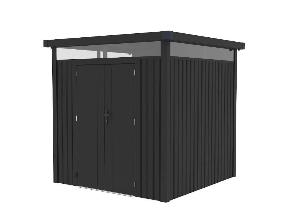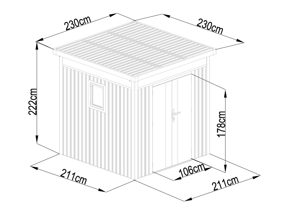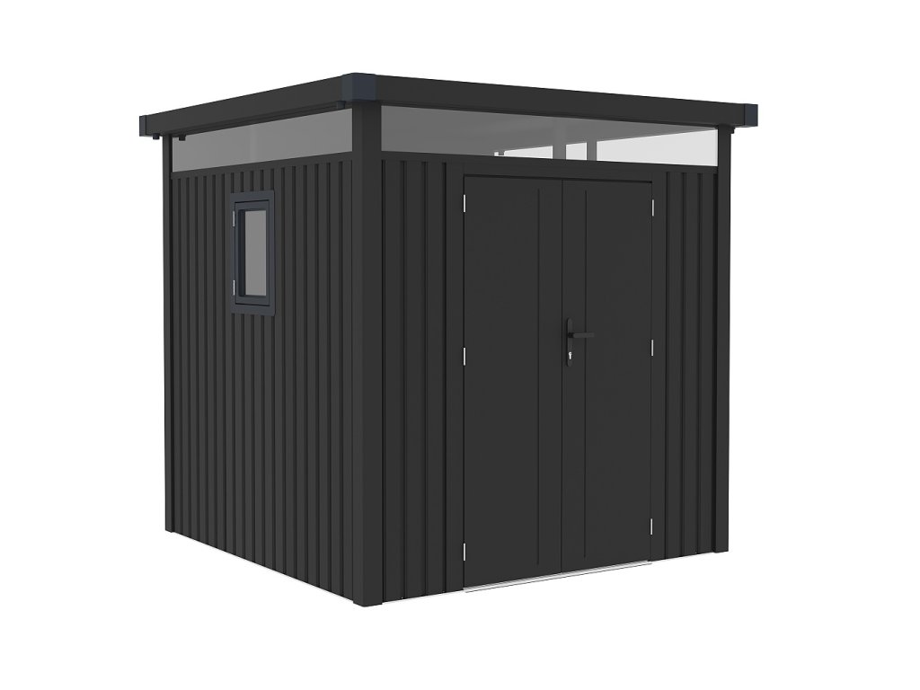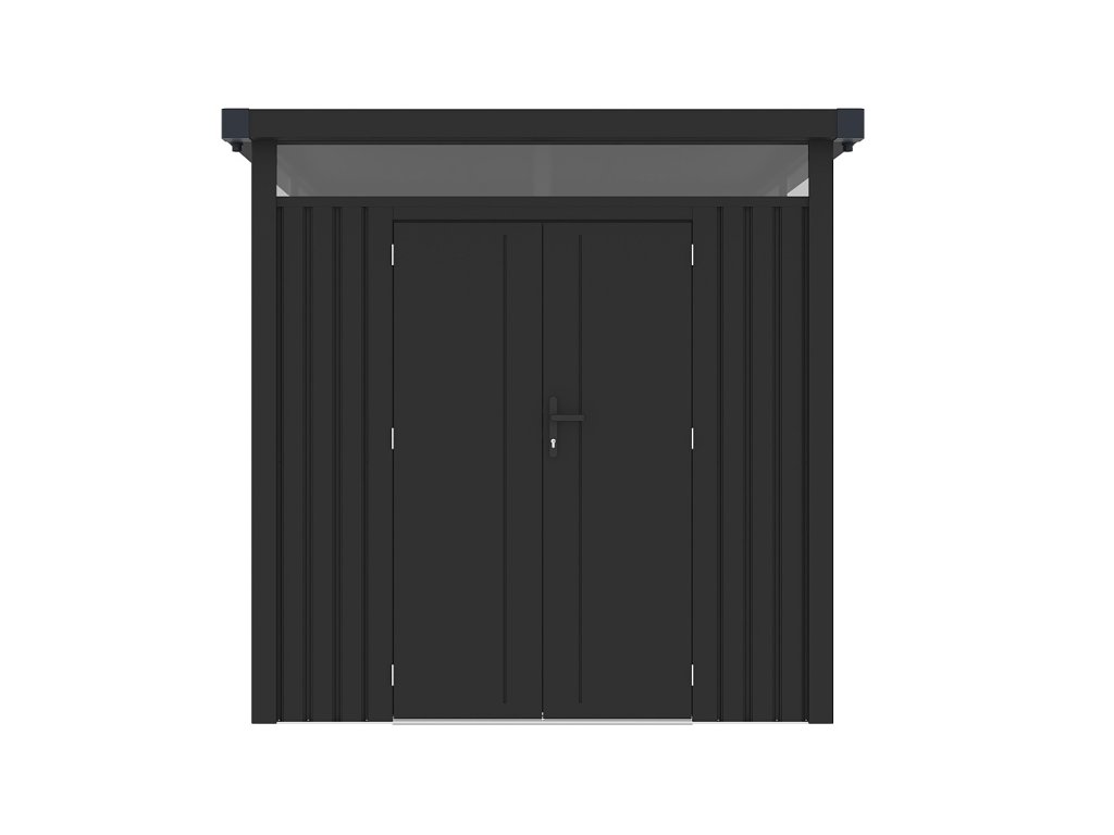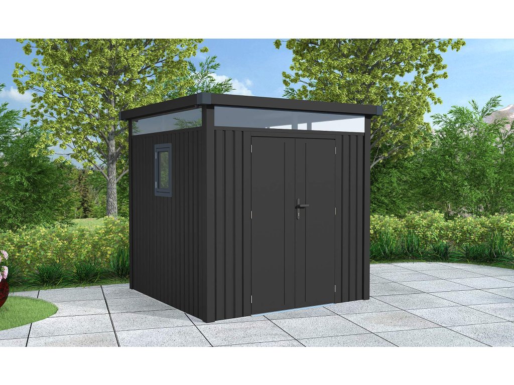 Táto praktická konštrukcia váži 174 kg a má antracitovú farbu, ktorá sa ľahko začlení do každého vonkajšieho prostredia. Plochá strecha a dvojité krídlové dvere s rozmermi š 106 x v 178 cm dodávajú domčeku jednoduchý a moderný vzhľad.