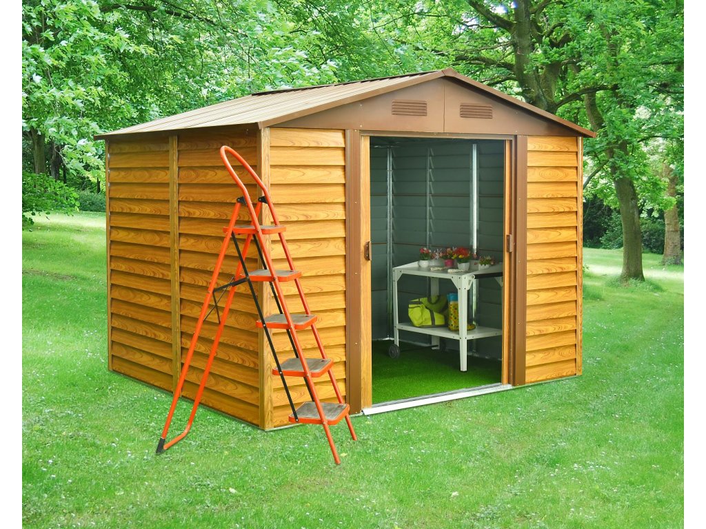 Domček je vyrobený z pozinkovaného vodorovne profilovaného plechu a vzhľadovo (dizajnovo aj farebne) sa približuje drevenému domčeku. Domček je možné použiť na uskladnenie záhradkárskych, športových, bazénových, grilovacích, campingových, motoristických a ďalších potrieb. Moderný design, farba, jednoduchá montáž, celoročné použitie. Kvalitný materiál s povrchovou úpravou - elektrolyticky pozinkovaný plech so žiarovo nanesenou farbou. Sedlová strecha, čelné posuvné dvere. Možnosť uzamknutia (zámok nie je obsahom dodávky).