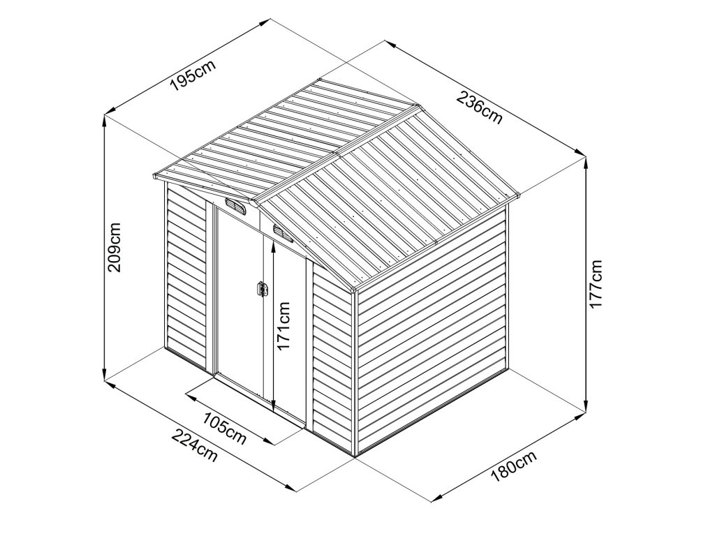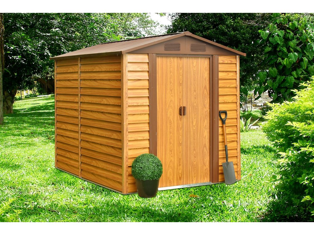 Domček je vyrobený z pozinkovaného vodorovne profilovaného plechu a vzhľadovo (dizajnovo aj farebne) sa približuje drevenému domčeku. Domček je možné použiť na uskladnenie záhradkárskych, športových, bazénových, grilovacích, campingových, motoristických a ďalších potrieb. Moderný design, farba, jednoduchá montáž, celoročné použitie. Kvalitný materiál s povrchovou úpravou - elektrolyticky pozinkovaný plech so žiarovo nanesenou farbou. Sedlová strecha, čelné posuvné dvere. Možnosť uzamknutia (zámok nie je obsahom dodávky).
