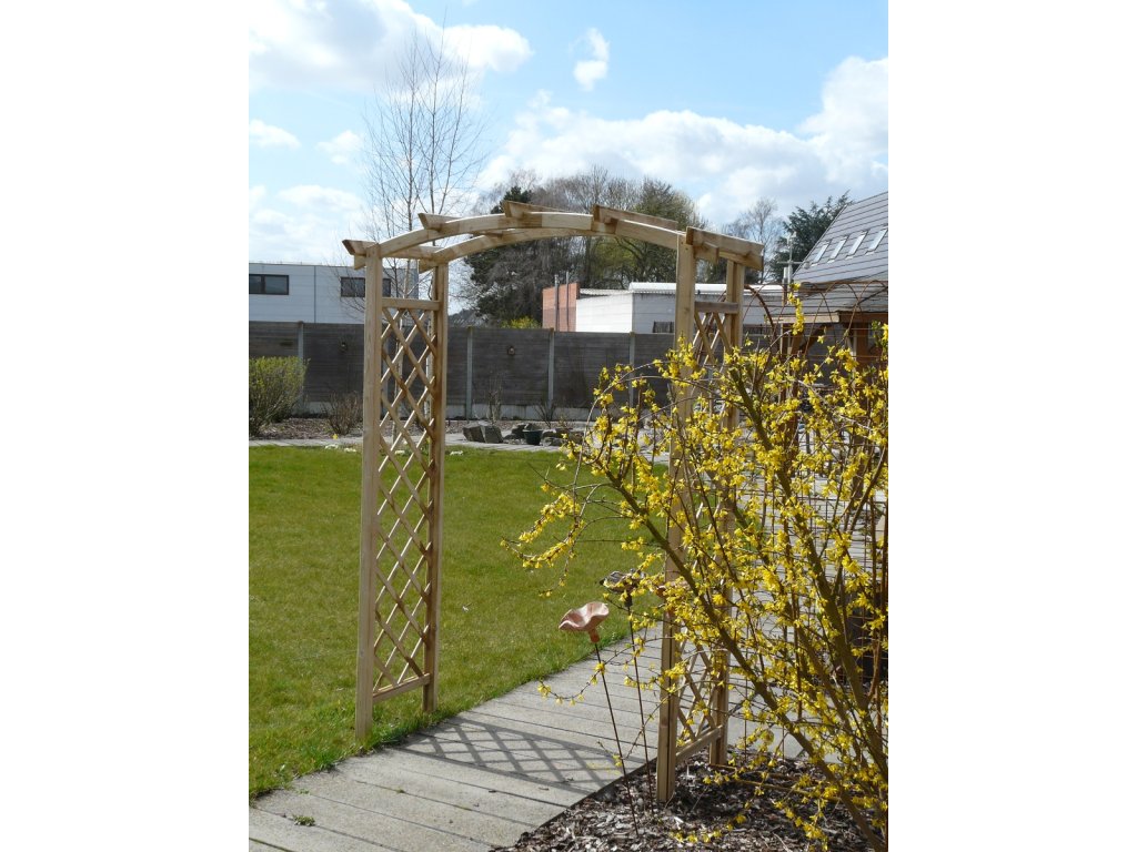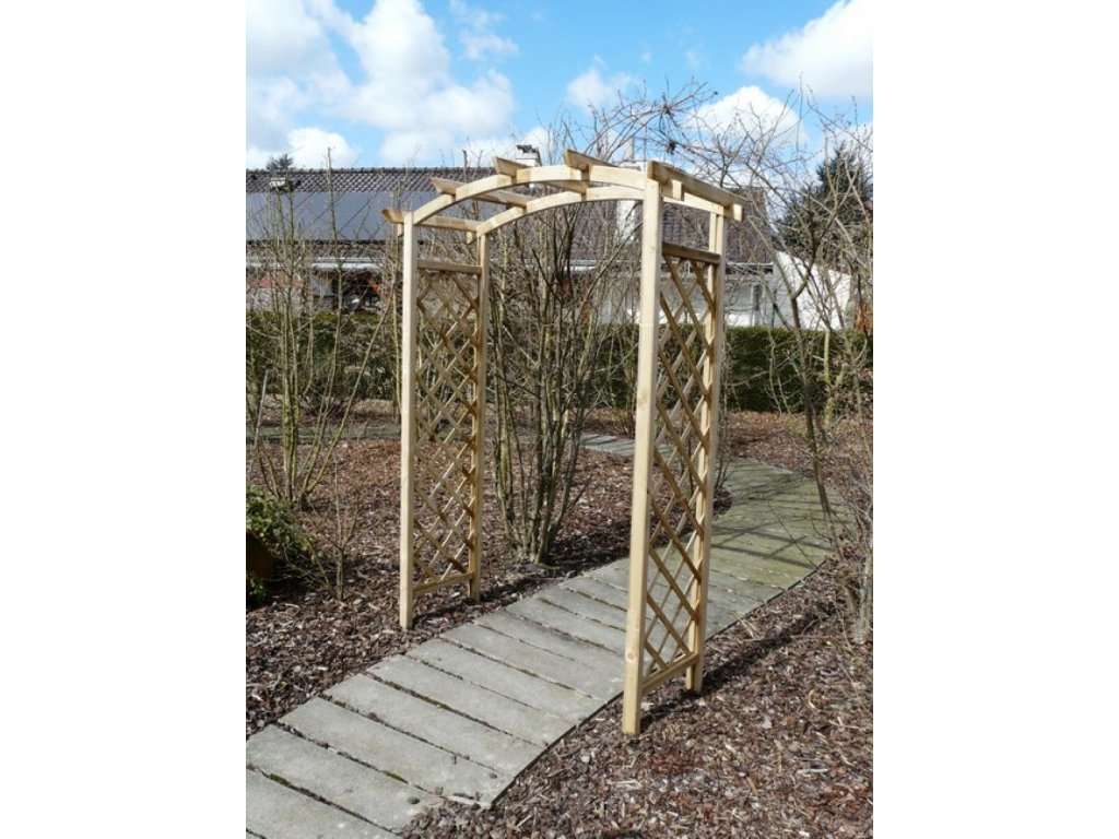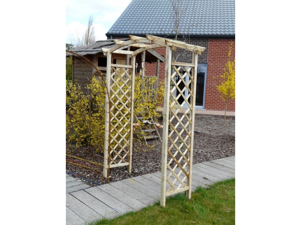 Vysoko kvalitná drevená pergola, resp. oblúk na ruže na ruže (na popínavé rastliny) môže byť zaujímavým dizajnovým prvkom vašej záhrady. Pre rastliny ponúka stabilnú základňu a akonáhle rastliny prerastú oblúkom vytvoria príjemnú časť záhrady. Tento ružový záhradný oblúk je vyrobený zo zeleno impregnovaného borovicového dreva extrémnej hrúbky 4,5 cm.