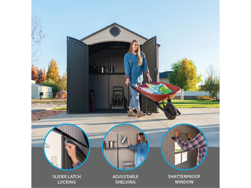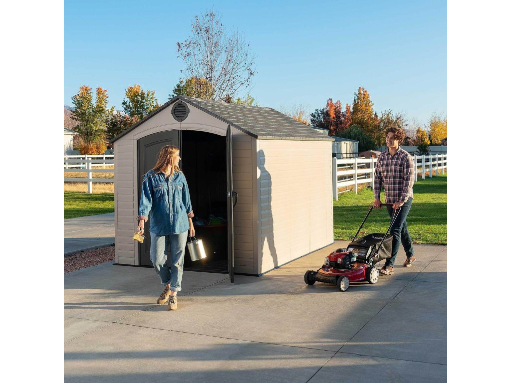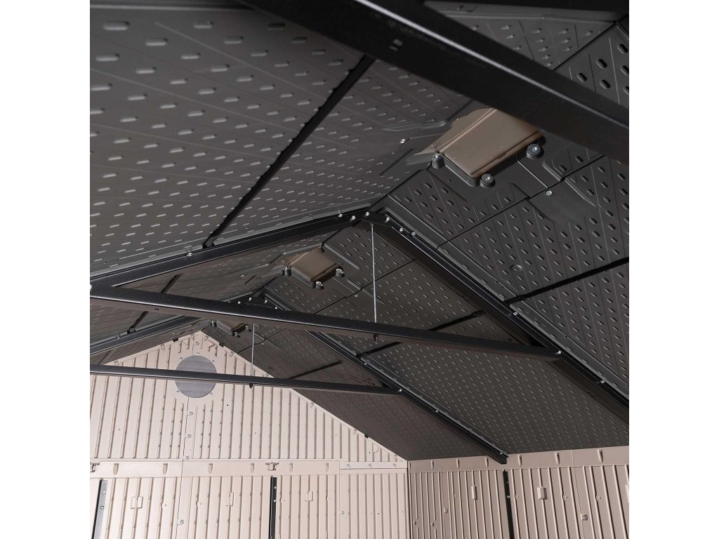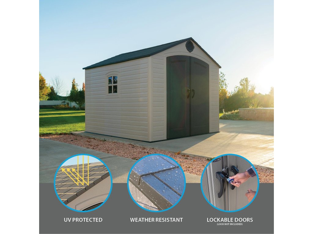 Robustný plastový domček "novej generácie" LIFETIME CLASSIC LINE 60371 na uskladnenie záhradkárskych, športových, bazénových, grilovacích, campingových, motoristických a ďalších potrieb. Moderný design, jednoduchá montáž, celoročné použitie. Záhradný domček má nosnú kovovú konštrukciu a dvojité steny, strecha, dvojité dvere, podlaha sú vyrobené z masívneho veľmi odolného a prakticky nerozbitného plastu. Plastová protišmyková podlaha je súčasťou domčeka (je v cene). Domček je vybavený dvojkrídlovými dverami na pántoch. Sila dvojitej plastovej steny je 26 mm. Sklon strechy je 30 °, čo výrazne znižuje množstvo a tlak snehu na strechu. Materiál domčeka (extrémne odolný polyetylén s UV filtrom) nežltne ani nekrehne, takže odpadá pravidelné natieranie domčeka ako je nutné v prípade napr. drevených domčekov - záhradný plastový domček je prakticky bezúdržbový. Domček je navrhnutý a vyrobený tak, aby montáž bola čo najjednoduchšia a najkratšia. Jednotlivé diely iba zaklapnete do susedných dielov a spoj zaistíte skrutkou.