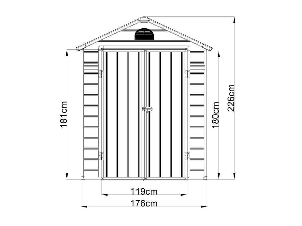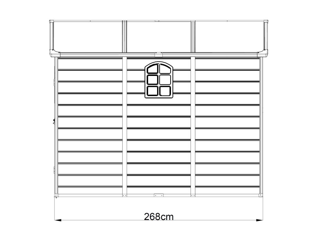 Veľké dvojkrídlové vstupné dvere 119 x v 181 cm a bočné okno (možno umiestniť na ľavú aj pravú stranu) dodávajú domčeku praktickosť a flexibilitu. Ventilačná mriežka zaisťuje optimálne odvetrávanie a cirkuláciu vzduchu vo vnútri domčeka.