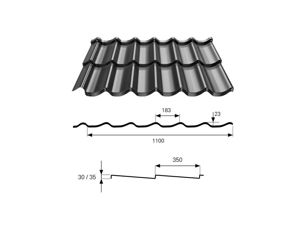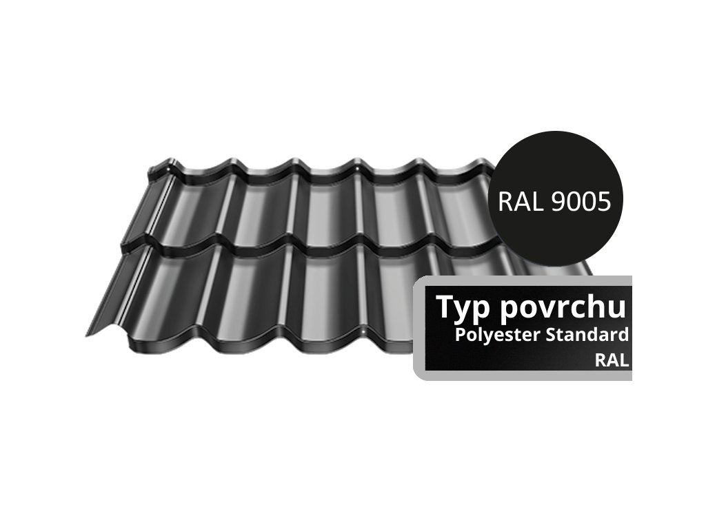 Plechová strešná krytina BP2 modul ALFA 2.0 škridla 350 mm 0,5 RAL lesklá 9005