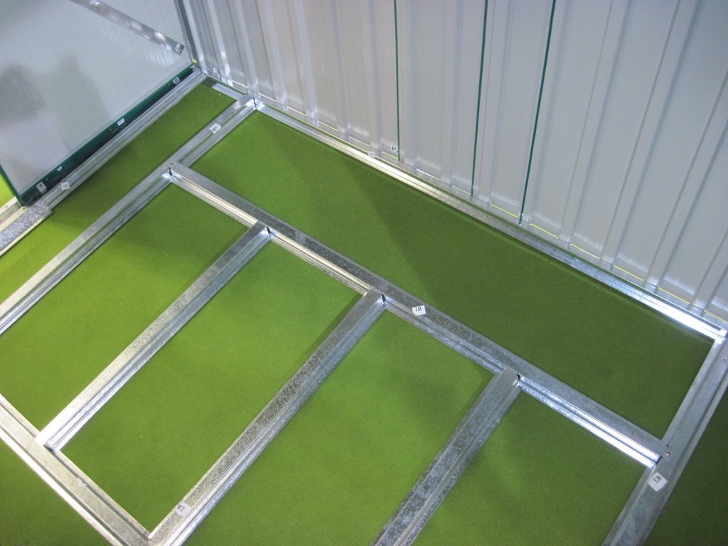 Podlahová konštrukcia - sada zoskrutkovaných oceľových profilov, ku ktorej je možné zhora priskrutkovať podlahu. Vďaka podlahovej základni si môžete vytvoriť v domčeku pevnú a suchú podlahu na uskladnenie čohokoľvek zo záhrady.