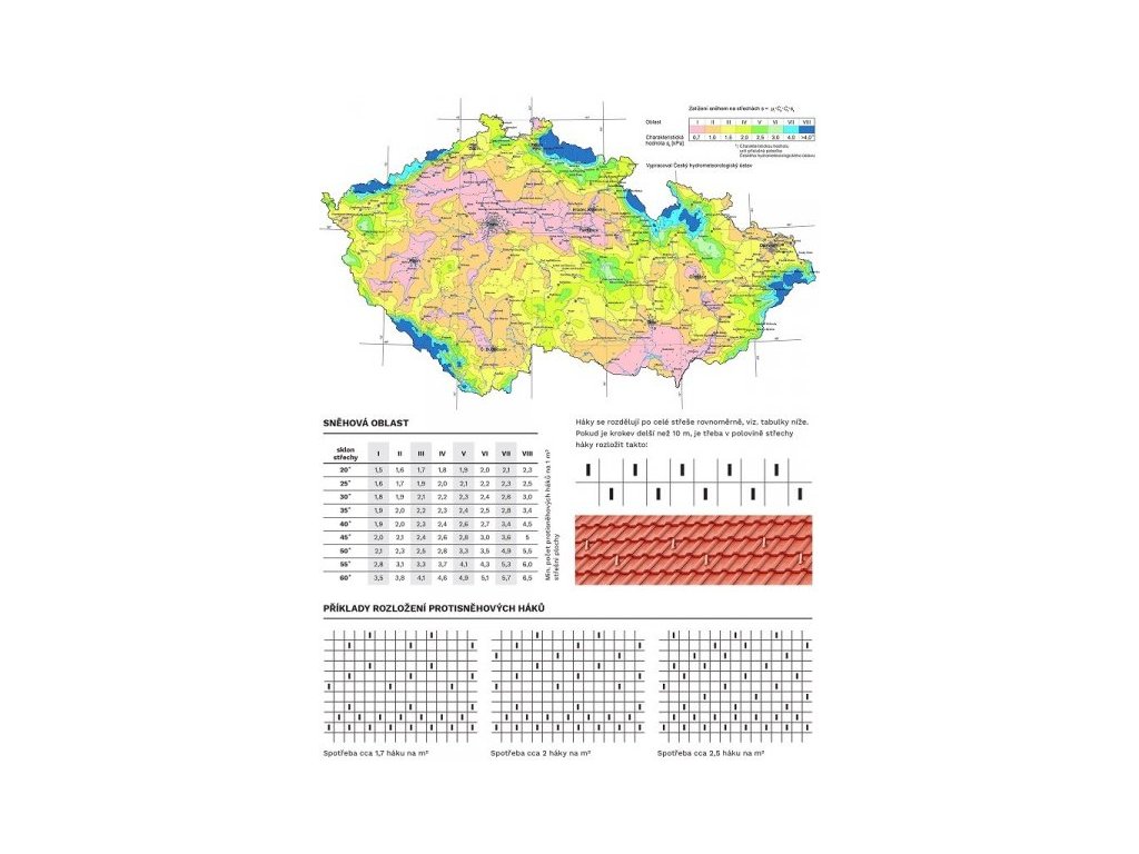 Pri absencii snehových hákov môže dôjsť k poškodeniu odkvapového systému, ale aj samotnej strešnej krytiny. Nemenej dôležitá je ochrana chodcov, áut a majetku pred schádzajúcim snehom. Množstvo protisnehových zábran závisí od sklonu strechy a snehovej oblasti. Schéma kladenia platí rovnaké ako pri škridli protisnehovej.
