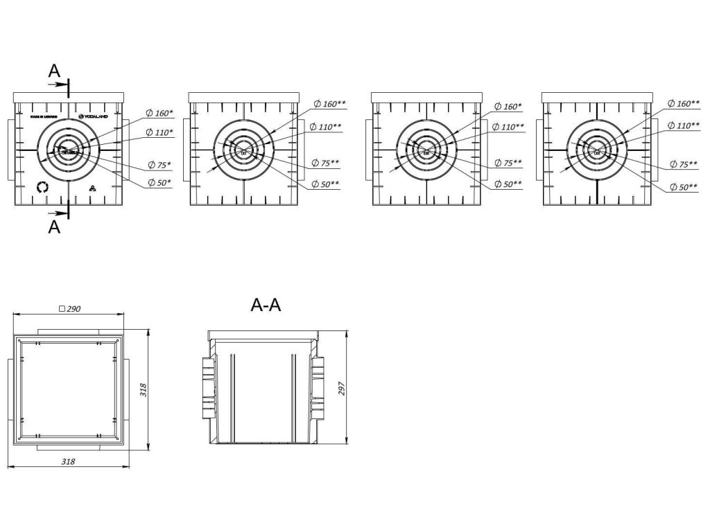 - vonkajší priemer vtokov/odtokov: 50 mm, 75 mm, 110 mm, 160 mm