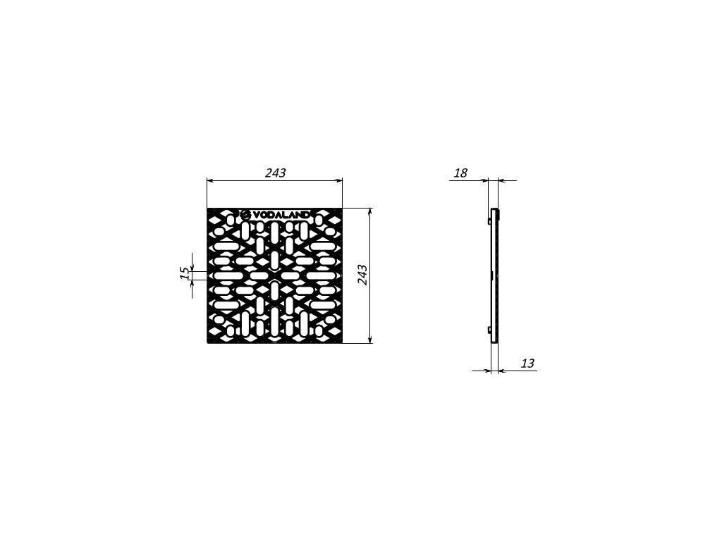 Tento rošt je vyrobený z veľmi odolnej liatiny a slúži ako doplnkový prvok pre uzavretie revíznej šachty VODALAND EASY s rozmerom 250 x 250 mm. Bežne sa tiež používa ako samostatný doplnkový prvok, ktorý poskytuje spoľahlivé uzavretie akýchkoľvek už skôr inštalovaných betónových, murovaných alebo plastových šácht a priehlbín v zemi. Poskytuje vysokú mechanickú, chemickú a tepelnú odolnosť, odolnosť proti poveternostným vplyvom a UV žiareniu, protišmykový povrch, jednoduchú údržbu a inštaláciu a tiež dlhú životnosť. Tento typ roštu je možné využiť v priestoroch rodinných domov, chalúp, chát, budov, dvorčekov, terás, záhrad, peších zón, cyklotrás a chodníkov.