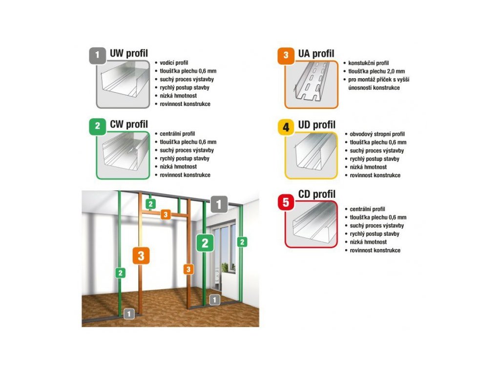Je teda súčasťou, stavebným prvkom pre tvorbu sadrokartónové konštrukcie. Konštrukčný profil pre sadrokartónové priečky. Pre stenové konštrukcie z pozinkovaného plechu hrúbky 0,6 mm. Kvôli akustickému oddeleniu nalepíme na spodnú stranu krajného CW profilu penové samolepiace tesnenie. Pomocou natĺkacích hmoždiniek pripevníme CW profil k existujúcej zvislej konštrukcii.