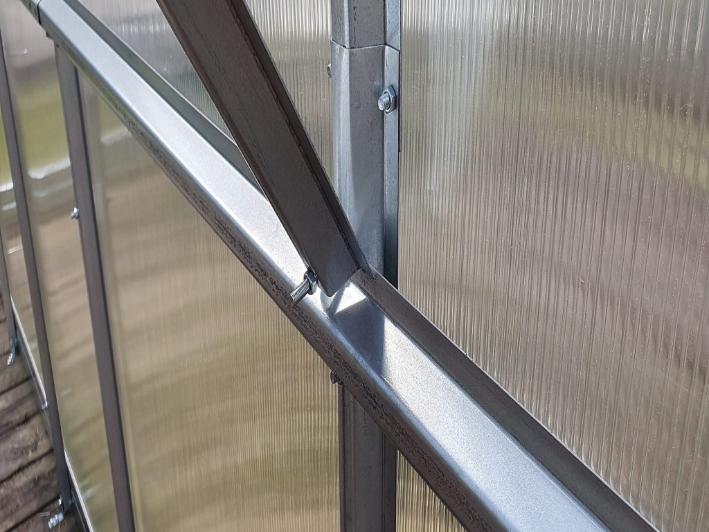 Konštrukcia skleníka je zoskrutkovaná zo žiarovo pozinkovaných oceľových omega profilov šírky 56 mm a hrúbky 1 mm. Profily sú žiarovo pozinkované = oceľ sa po príslušnej predbežnej úprave ponorí do zinkového kúpeľa s teplotou cca 450°C, zinok a oceľ pritom spolu reagujú a na povrchu ocele sa vytvorí zliatina železa a zinku. Toto nezničiteľné spojenie zinku a ocele vytvorí extrémne silnú odolnosť voči korózii. Jednotlivé rebrá nosných oblúkov sú od seba vzdialené osovo 100 cm. Predné čelo má dvojdielne dvere na pántoch, zadné čelo obsahuje vetracie okienko. Skleník nie je priechodný. Ako príplatkové príslušenstvo je možné dokúpiť strešné ventilačné okno, automatický otvárač okna, rôzne druhy regálov, teplomery, vlhkomery a pod.