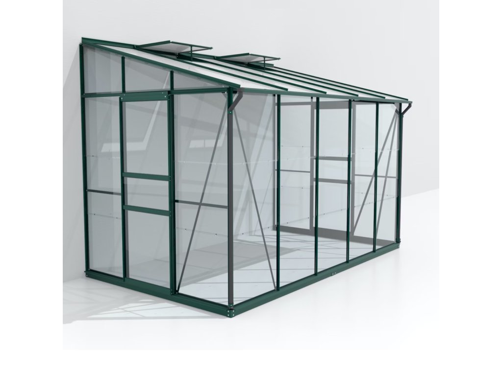 Skleník je vybavený dvojkrídlovými dverami (1,22 x 1,63 m), AL profilmi, presklením, 2x strešným ventilačným okienkom s manuálnym otváraním, všetkým spojovacím materiálom. Skleník je možné postaviť buď na murovanú podmurovku (potom nie je nutné dokupovať základňu z pozinkovaného plechu) alebo na základňu z pozinkovaného plechu (nutné dokúpiť). Pri stavbe bez murovanej podmurovky dokúpenie základne určite odporúčame. Ku skleníku je možné dokúpiť rad nadštandardného príslušenstva - poličky, regály, teplomery, vlhkomery, zavlažovacie zariadenie, elektrické odporové vykurovanie pôdy. Balené v papierovom kartóne. Presklenie je zabalené v nevratnej drevenej debne.