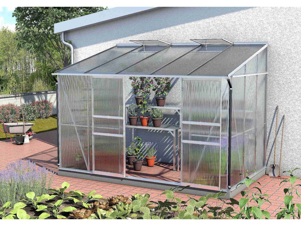 Skleník je vybavený dvojkrídlovými dverami (1,22 x 1,63 m), AL profilmi, presklením, 2x strešným ventilačným okienkom s manuálnym otváraním, všetkým spojovacím materiálom. Skleník je možné postaviť buď na murovanú podmurovku (potom nie je nutné dokupovať základňu z pozinkovaného plechu) alebo na základňu z pozinkovaného plechu (nutné dokúpiť). Pri stavbe bez murovanej podmurovky dokúpenie základne určite odporúčame. Ku skleníku je možné dokúpiť rad nadštandardného príslušenstva - poličky, regály, teplomery, vlhkomery, zavlažovacie zariadenia, elektrické odporové vykurovanie pôdy.