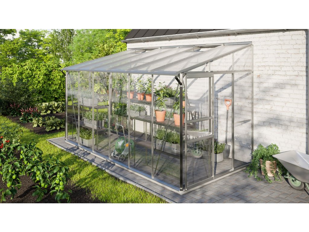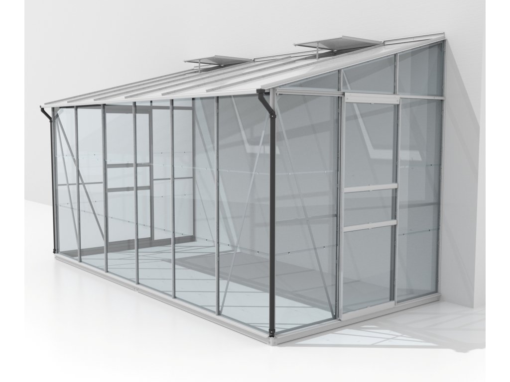 Skleník je vybavený dvojkrídlovými dverami (1,22 x 1,63 m), AL profilmi, presklením, 2x strešným ventilačným okienkom s manuálnym otváraním, všetkým spojovacím materiálom. Skleník je možné postaviť buď na murovanú podmurovku (potom nie je nutné dokupovať základňu z pozinkovaného plechu) alebo na základňu z pozinkovaného plechu (nutné dokúpiť). Pri stavbe bez murovanej podmurovky dokúpenie základne určite odporúčame. Ku skleníku je možné dokúpiť rad nadštandardného príslušenstva - poličky, regály, teplomery, vlhkomery, zavlažovacie zariadenie, elektrické odporové vykurovanie pôdy. Balené v papierovom kartóne. Presklenie je zabalené v nevratnej drevenej debne.