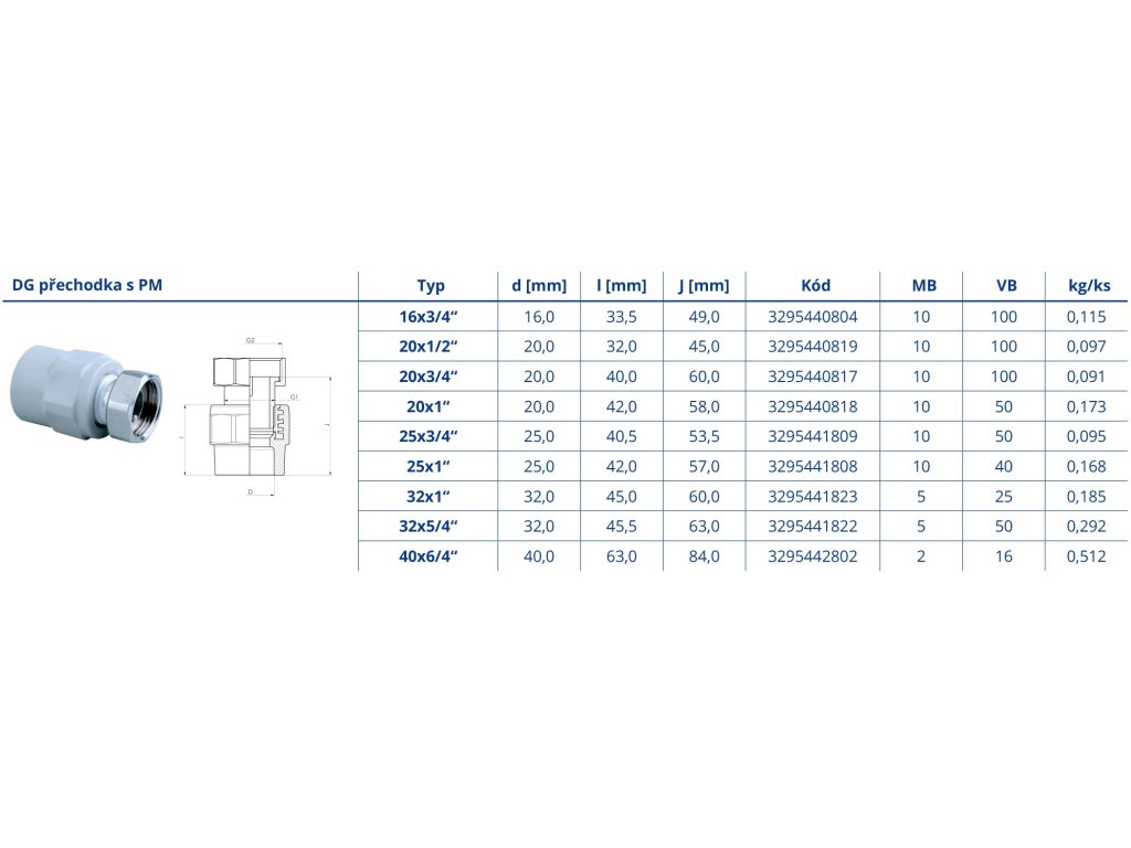 Kompaktná vodovodná DG prechodka PP-R s vnútorným kovovým závitom 3/4" pre vnútorné rozvody pitnej, studenej a teplej vody