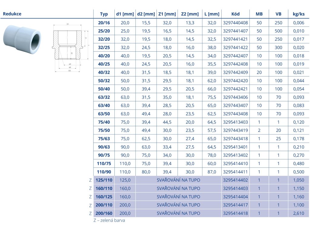 Kompaktná celoplastová redukcia z kopolyméru PP-R je určená ako doplnok pre vodovodné rúrky PP-R a PP-RCT, ktoré slúžia pre vnútorné rozvody pitnej, studenej a teplej vody. Vyznačuje sa vysokou odolnosťou voči teplote aj tlaku a nepodlieha korózii. Montáž tejto redukcie je veľmi jednoduchá a je možné ju spájať pomocou polyfúzneho zvárania alebo zvárania na tupo.