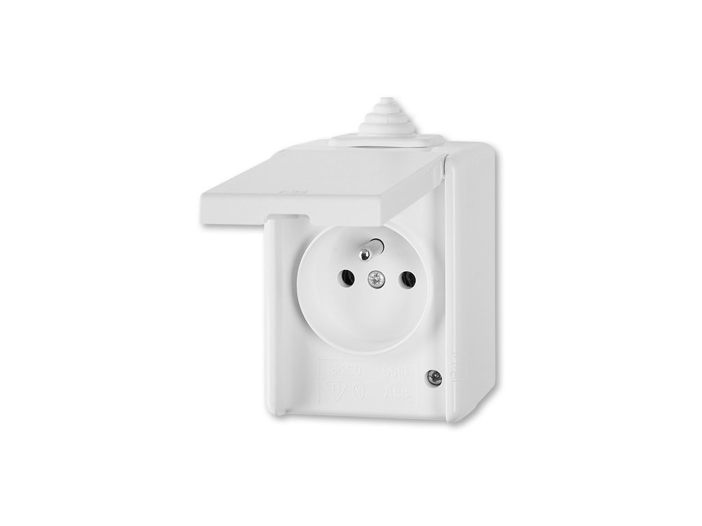 Jednonásobná zásuvka ABB PRAKTIK 5518-2929 B IP44 s ochranným kolíkom a viečkom biela