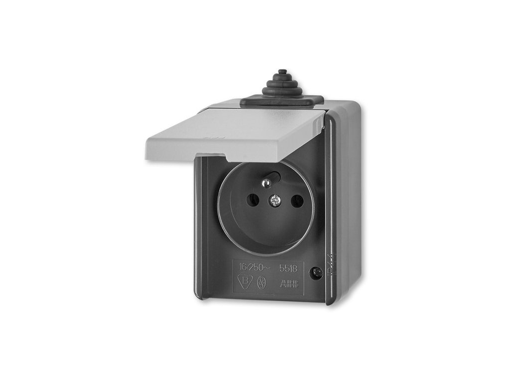 Zásuvka jednonásobná PRAKTIK IP44 s ochranným kolíkom a viečkom sivá